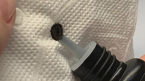4) 先確認有無美睫黑膠殘留,若瓶口有殘留美睫黑膠,請用指腹壓瓶身擠出殘留黑膠